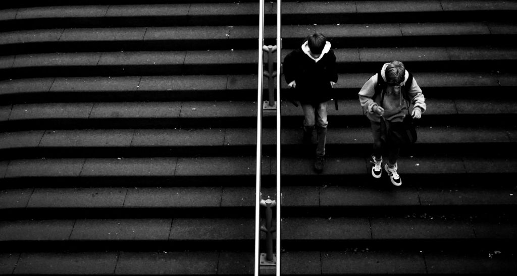 Two figures descend a staircase, each confined to their own side, separated by a cold steel railing. Their proximity is deceiving walking side by side yet worlds apart, each wrapped in their private silence. The symmetry of the steps emphasizes the unspoken distance between them, a reflection of how easily lives can run parallel without truly intersecting. The scene evokes the loneliness of shared spaces, where connection seems just out of reach.