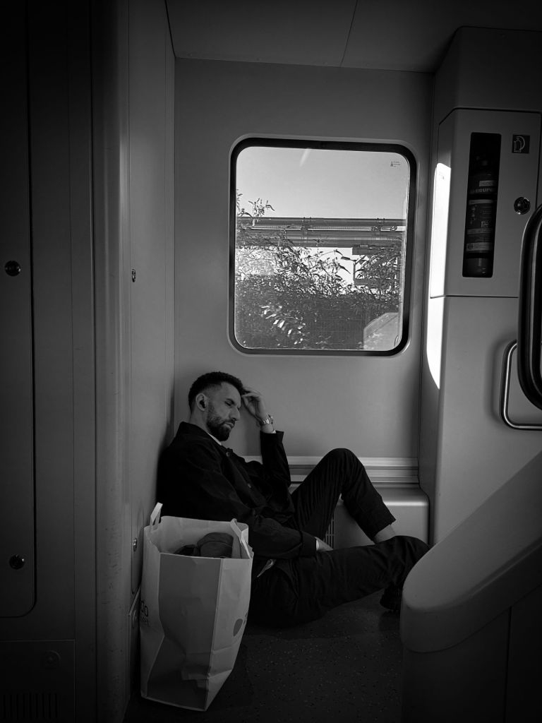 A man sits slumped in the corner of a train, his head bowed and his hand pressed to his temple, the weight of the world seemingly resting on his shoulders. The muted light from the window frames his solitude, contrasting the motion outside with his stillness. The discarded bag beside him hints at a long journey or a life in disarray. This moment encapsulates the quiet despair of exhaustion physical, emotional, or both where even the simplest acts of moving forward feel insurmountable.