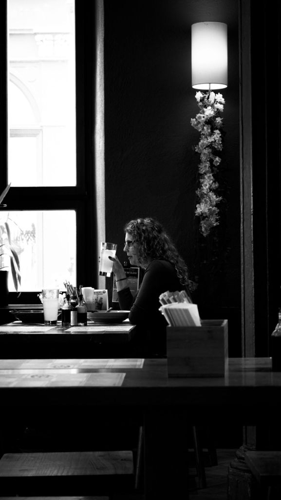 A woman sits alone in a dimly lit café, her gaze distant as she holds a glass in hand. The light from the window beside her spills softly into the space, highlighting her thoughtful expression and casting a sharp contrast against the dark walls. The delicate flowers climbing the lamp add a touch of fleeting beauty, a quiet reminder of life’s gentle grace amidst solitude. This image captures the introspective pause of a solitary moment, where thoughts linger in the quiet, and the world outside feels both close and unreachable.
