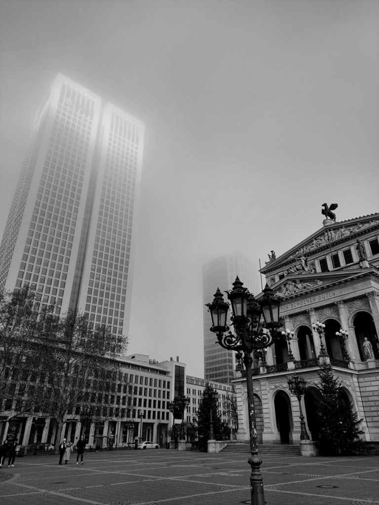 In the embrace of mist, the towering buildings appear ghostlike, disconnected from the world below. The classical architecture and streetlights, remnants of a bygone time, stand silently in contrast, as if mourning the vanishing humanity in this sprawling, alien cityscape.